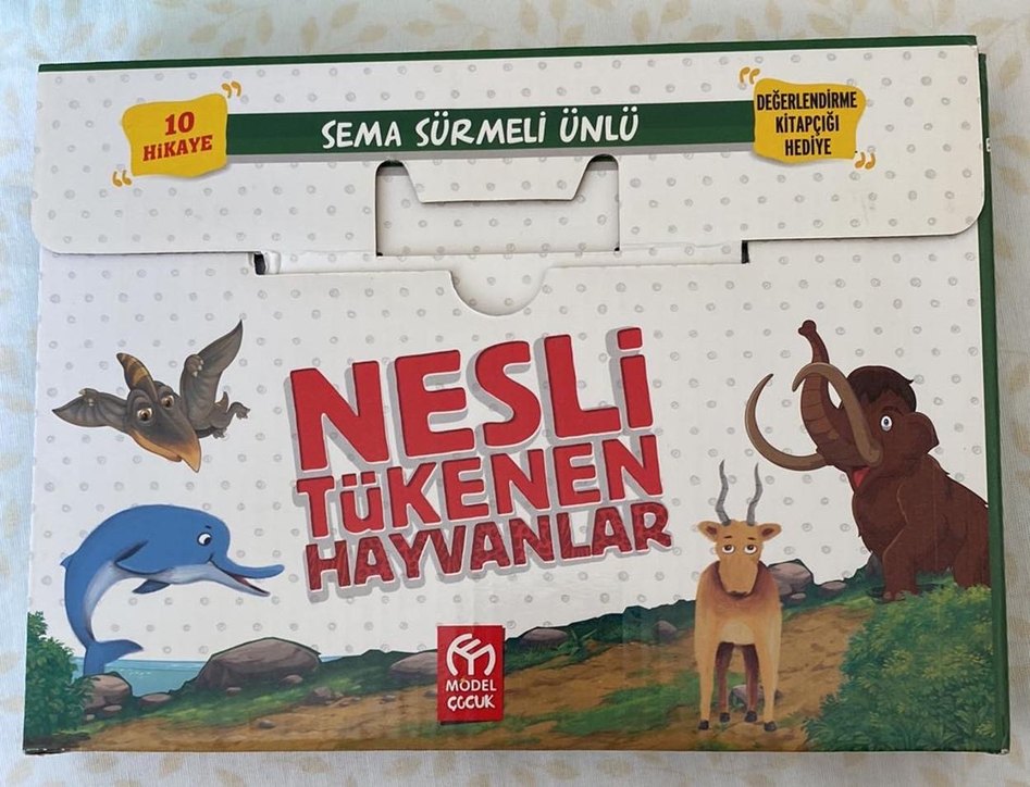 Parlak deve renklerinde çocuklar için nesli tükenen hayvanları anlatan eğitici kitabı. Sema Sürmeli Ünlü tasarımıdır.