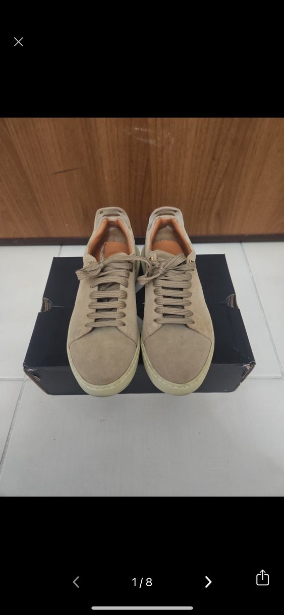 Bej süet günlük ayakkabılar, gri tonlu sokak stili ve desen içermeyen tasarımıyla zahmetsiz şıklık sunar.bi kaç kez giyildi