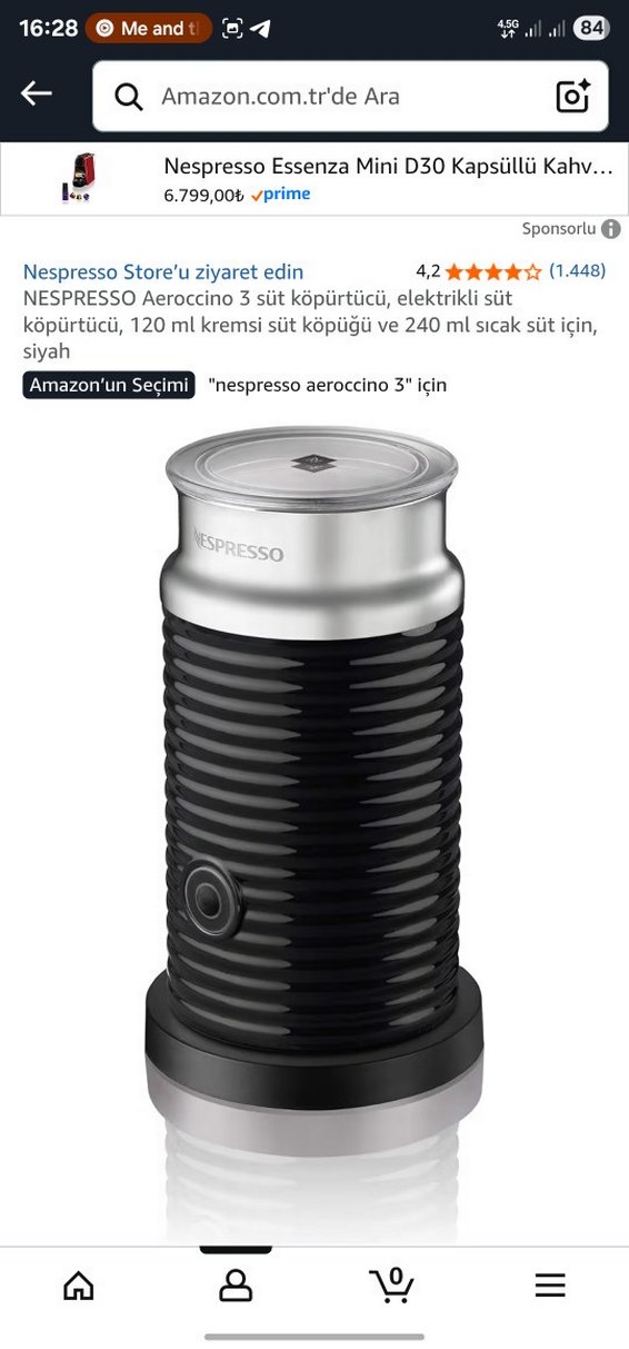 Nespresso Aeroccino 3 siyah renkli, elektrikli süt köpürtücüdür. 120 ml kremamsı süt köpüğü ve 240 ml sıcak süt hazırlayabilir ☕