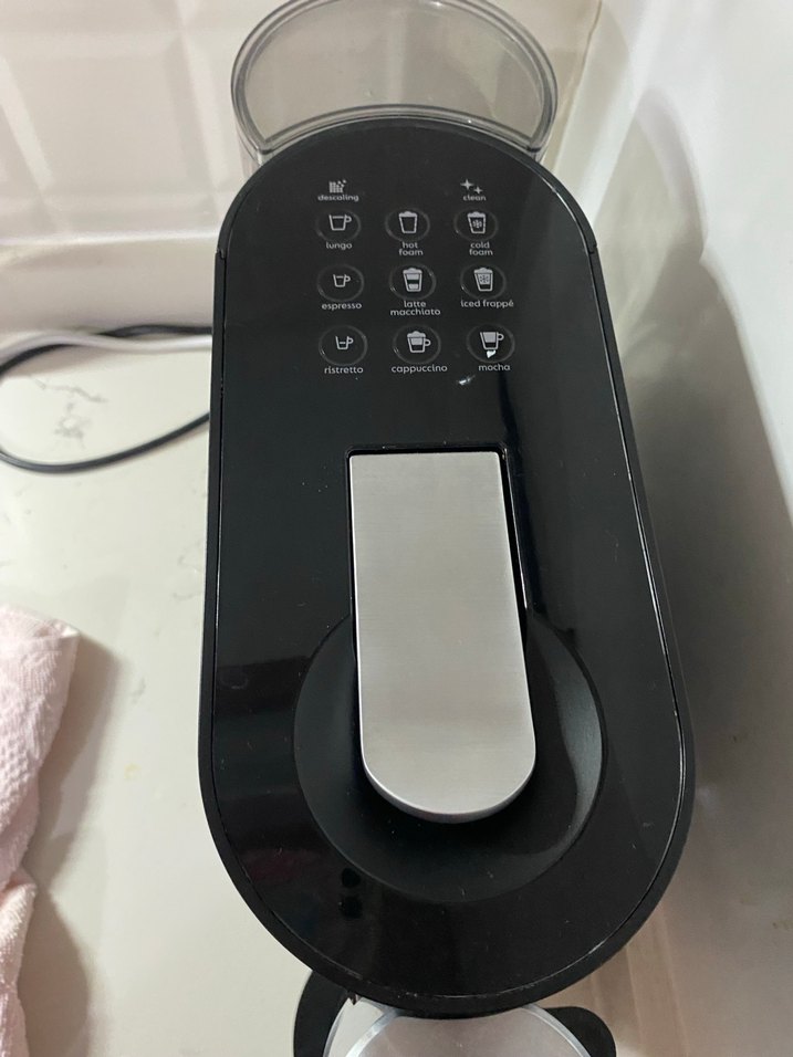Üst panelde çeşitli içecek seçenekleri bulunan tek kollu siyah kahve makinesi. Kompakt ve şık tasarıma sahiptir. ☕ Nespresso kapsül atelıer kahve makinesi
