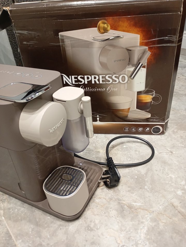 Bej renkte Nespresso kahve makinesi, süt köpürtücüsü ve kompakt yapıya sahiptir. Espresso ve kahve yapımı için uygundur. ☕