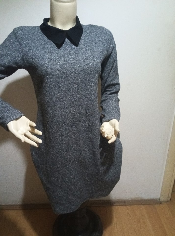 Gri midi triko elbise, siyah yakalı ve uzun kolludur. Rahat kesimi ve yumuşak dokusuyla günlük kullanıma uygundur. Sık boy 90 cm ıkı kol arası 50 cm bel 46 cm basen 57 cm