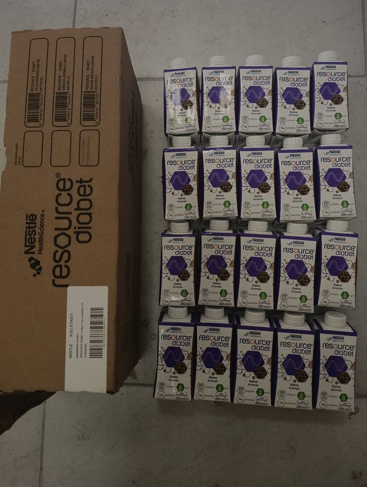 Nestlé Resource Diabet 20'li pakette, özel beslenme desteği için. Mor renkli plastik kutularda. SKT' si var. kutusunun üstünde yazıyor. vitamin değerleri ve protein içeriği açısından öğün niyetinde kullanılabilir enerji verir. Kahve aromalı tekli veya set şeklinde almak için yazabilirsiniz.