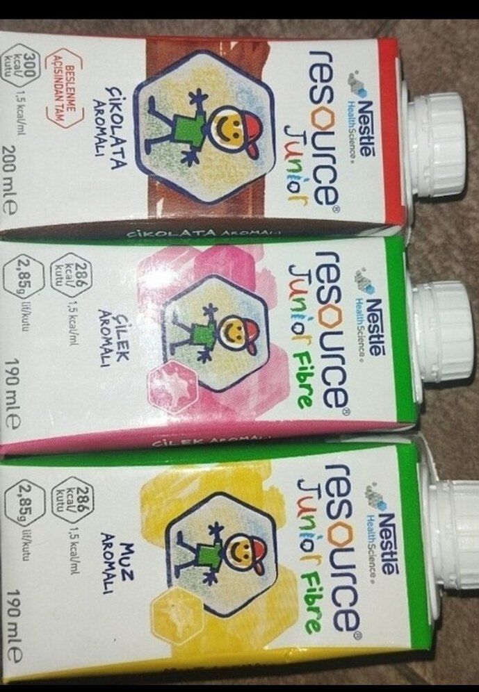 Nestle Resource Junior Fiber çikolata, çilek ve muz aromalı, renkli 190-200 ml paketlerde sunulur. Her pakette 28g karbonhidrat ve 2.85g protein bulunur.
