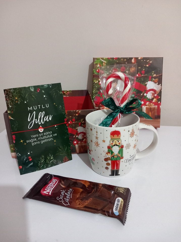 Nestlé sıcak çikolata, kurşun asker desenli kupa, şeker kamışı, yılbaşı temalı mum ve yeni yıl kartı içeren hediye seti. instagram: @elifhediyeatolyesi. FİYAT GARDROPSA ÖZEL 500TL Kâr payı koymuyorum bilginize
