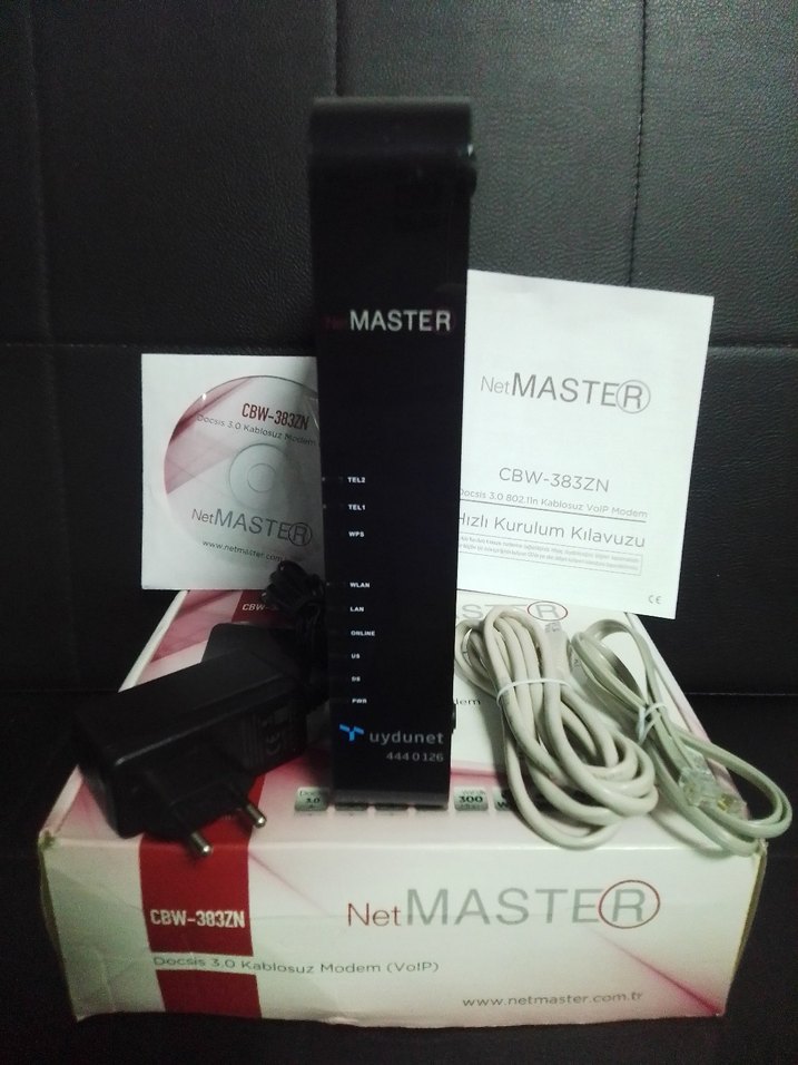 NetMASTER CBW-383ZN siyah modem, kablolar ve kurulum kılavuzu ile birlikte. VoIP bağlantısı için uygundur, çoklu gösterge ışıkları ve kompakt tasarıma sahiptir. sisteme tanıtılıp kullanılabilir durumda