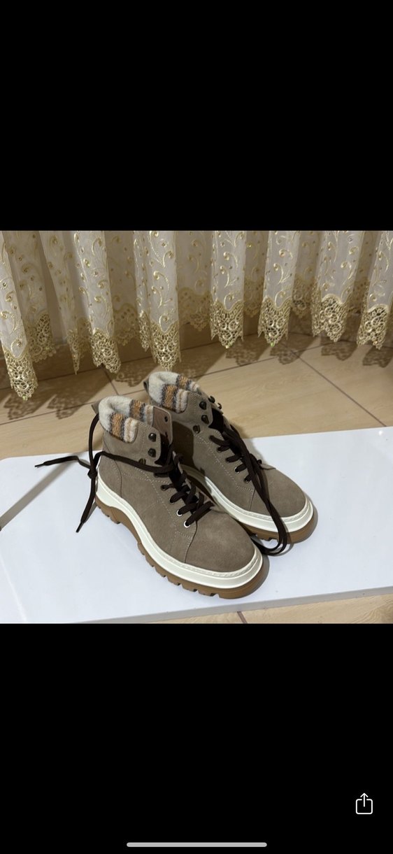 Kahverengi süet botlar, platform topuklu ve kürk detaylıdır, hafif yılan desenine sahiptir, rahat sokak stili için uygundur.