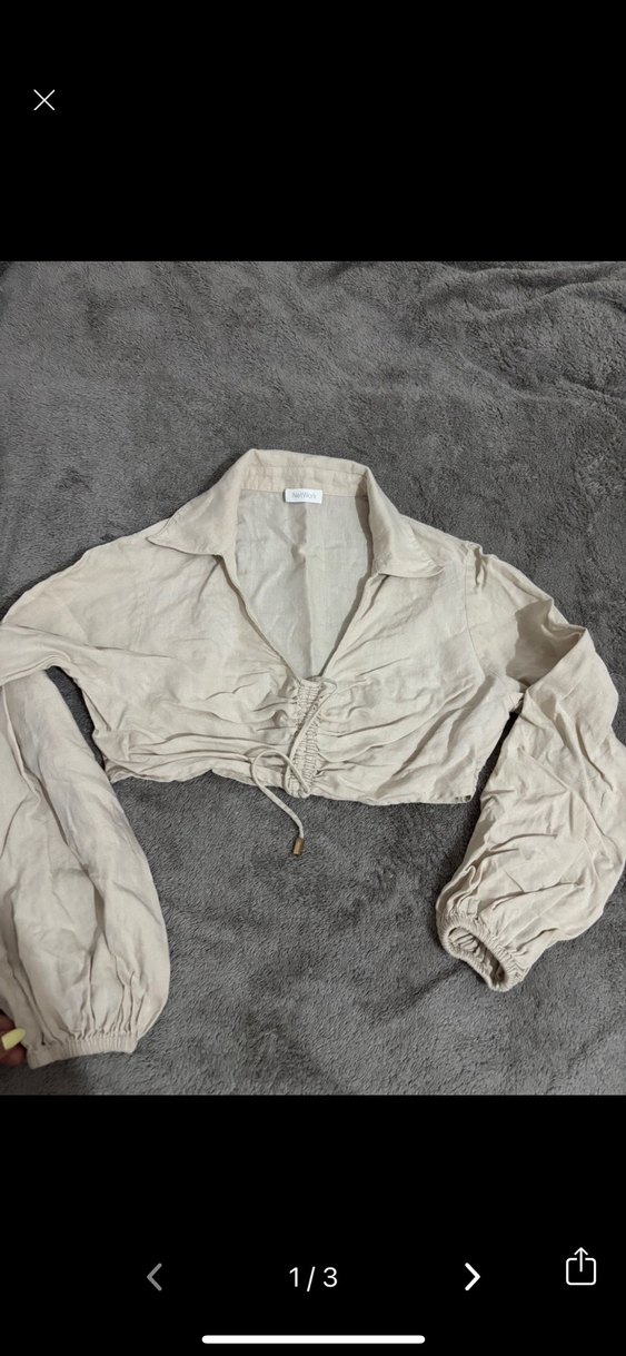 Bej keten kumaştan yapılmış, uzun kollu ve düğmeli mini gömlek. Sorunsuzz