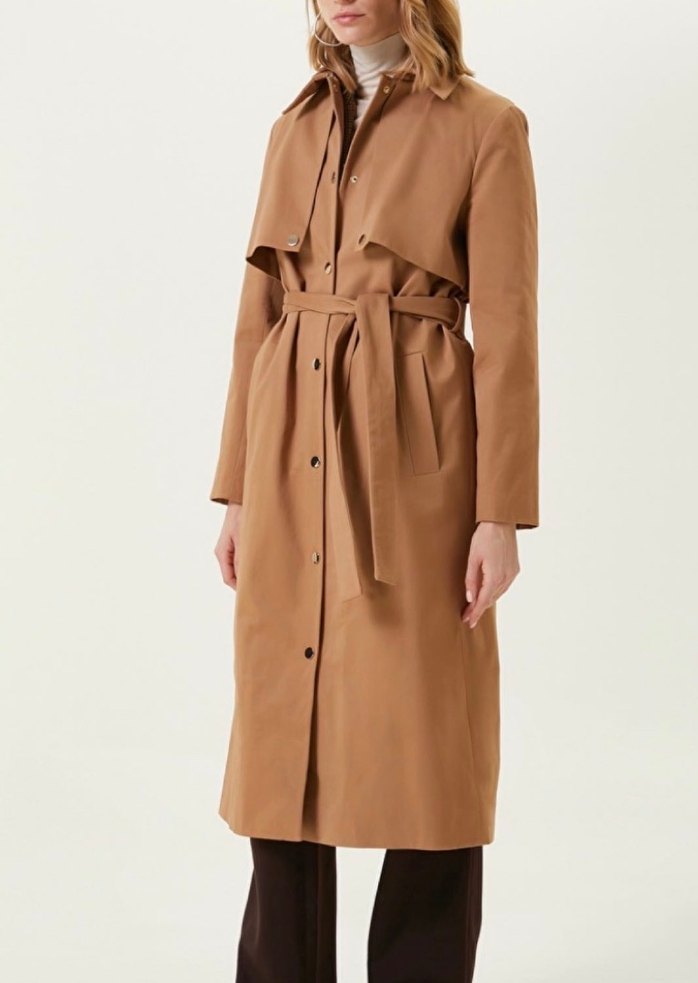 Bej renkli uzun kemerli trençkot, yumuşak sentetik kumaştan üretilmiştir. Notch yaka ve askılı kollara sahip, ofis için uygundur.