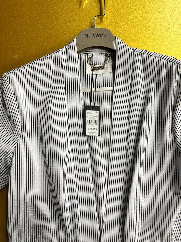 NetWork markalı beyaz, çizgili kadın gömleği, yakasında notched lapel ve düğmeli tasarım vardır. Sentetik kumaştan, kısa kollu ve normal kesimdir. Ofis için uygun midi uzunlukta şık bir gömlektir.