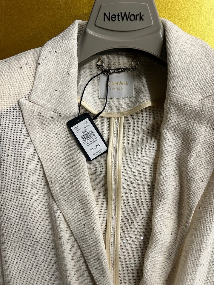 NetWork markalı beyaz pamuk blazer ceket, düğmeli ön ve kesimli yakaya sahiptir. Midi boy ve uzun kollu, ofis ve sokak modasına uygundur. Şık iş stili için ideal.