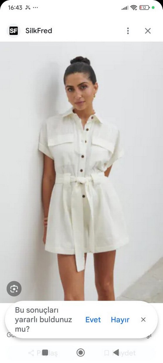 Kadınlar için beyaz keten kısa tulum, yakalı ve kısa kolludur. Kemerli bel detayıyla bol kesim sunar. Minimalist, gündelik şık ve sokak stiline uygundur. Mini boy ve desensizdir. sadece koltuk altında açılma vardır