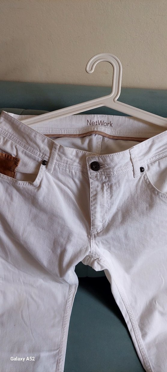 NetWork markalı beyaz pamuklu, bol kesim, düğmeli ve midi boy erkek pantolon, gündelik kullanıma uygun.