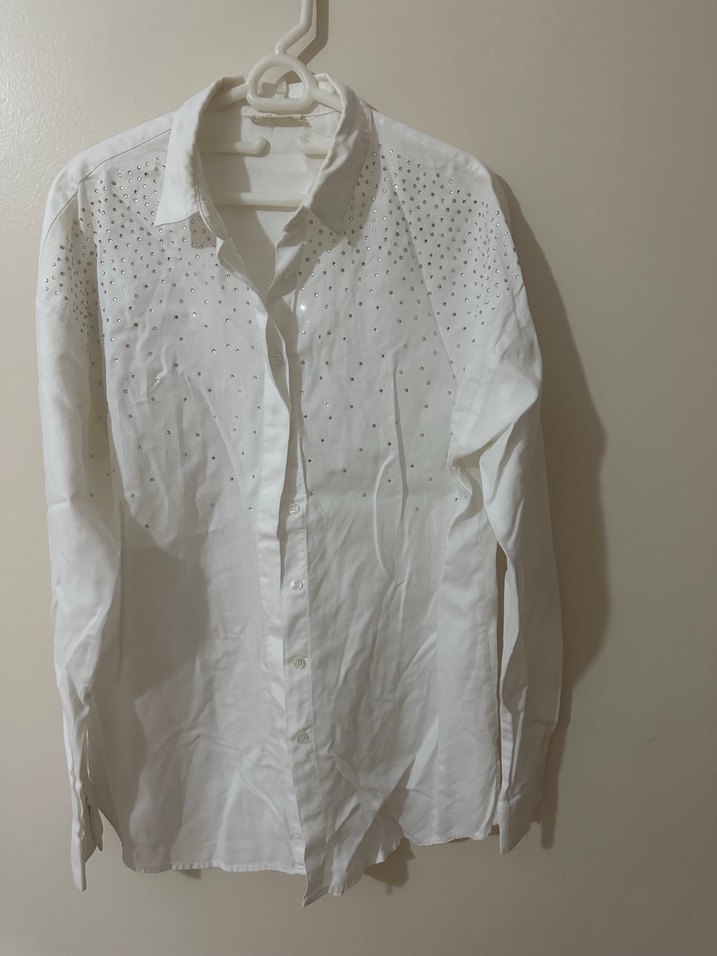 Network Beyaz, önün taşlı XS beden ( kalıbı çok geniş, M bedene rahatlıkla olur) % 100 pamuk Uzun kollu gömlek 2 koltuk arası: 55 cm, 2 omuz arası: 53 cm, uzunluk ( omuzdan etek ucuna): 61 cm.