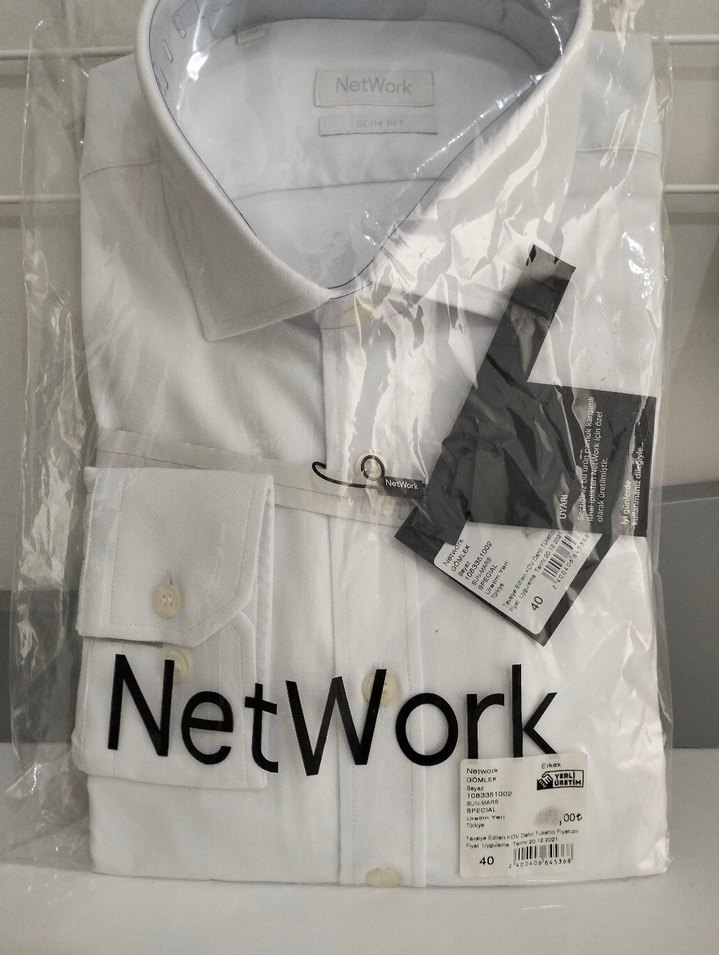 NetWork markalı, uzun kollu, yakalı ve düğmeli beyaz erkek gömleği. Ofis kullanımı için uygun, normal kesim ve sentetik kumaştan üretilmiştir.