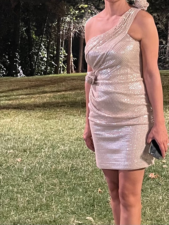 Network Tek omuz gül detaylı vücuda oturan bu abiye elbise, krem , drapeli detaylara sahip, düğünler için uygun. Bir kez giyildi astarlı şık ve kaliteli