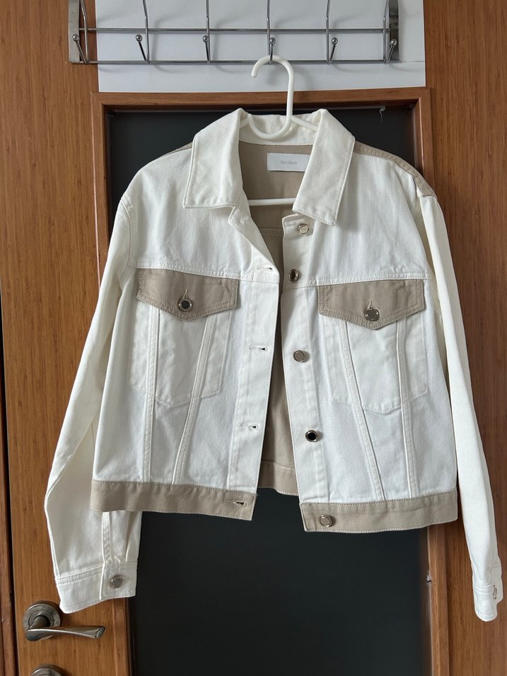 Uzun kollu, düğmeli beyaz pamuk denim ceket. Cep ve etek kısmında bej detaylar bulunur. Salaş kesim, günlük sokak stili için uygundur. Deforme yok hiç kullanılmadı
