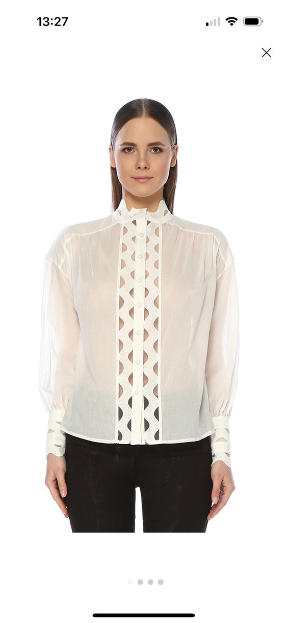 Yumuşak pamuk kumaştan, dantel işlemeli detaylarla süslenmiş, yüksek yakalı ve uzun kollu beyaz kadın gömleği.Yeni etiketli lazer kesim özel günlerde çok rahat kullanılabilir