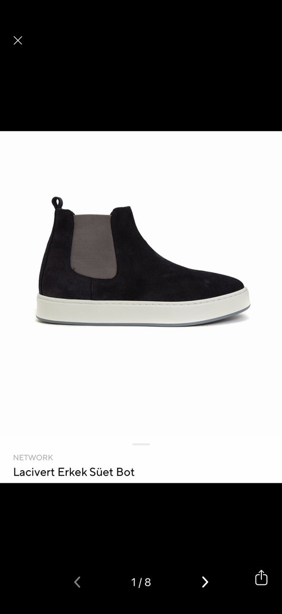 Network markalı lacivert %100 süet erkek bot, keçi derisi içerir. gri elastik yan paneller ve beyaz tabanlarıyla rahat ve şık bir sokak stili sunar. Sıfır etiketi duruyor altında kendi kuyusuyla gönderim olacak. Sezonda 7000-8000 civarında. İç tabanı deri şık bot