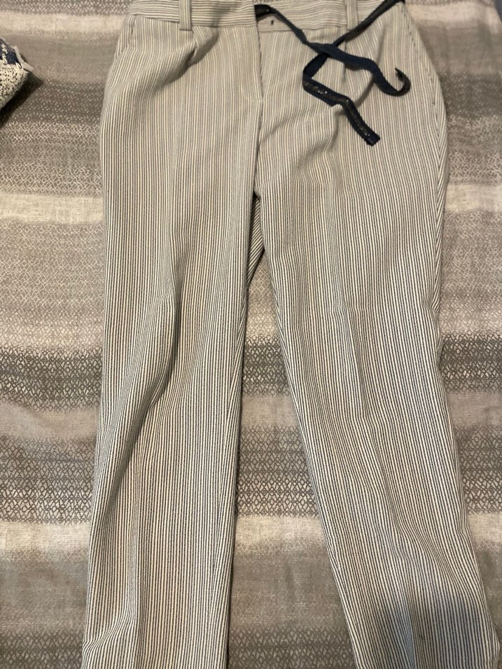 Gri çizgili, kemerli kadın kumaş pantolon. Normal boy ve regular fit, sentetik kumaştan, günlük rahat stil için uygun.