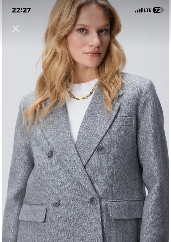 Gri renkli, düğmeli, yumuşak yün kumaştan üretilmiş kadın blazer ceket. Normal kesim, uzun kollu ve midi boyda, ofis kullanımı için uygundur.
