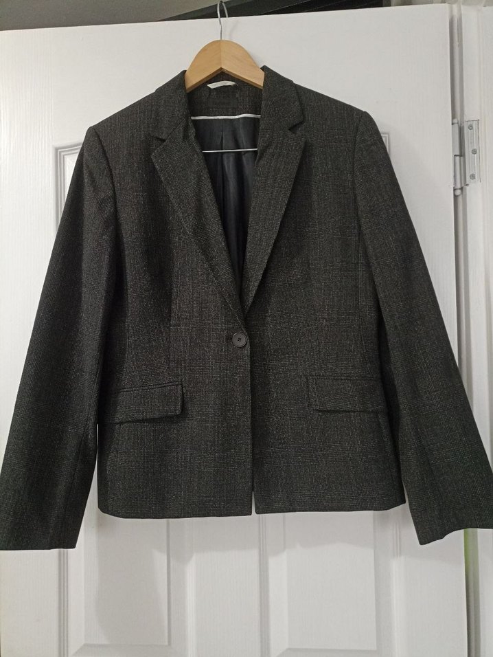 Notched yakalı, düğmeli, gri kadın blazer. Normal boy, uzun kollu ve klasik şıklıkta, ofis kullanımı için uygundur. Sentetik kumaştan üretilmiştir.