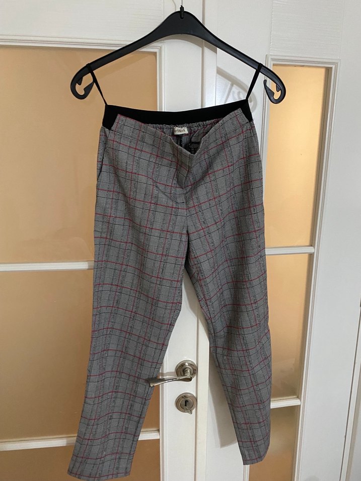 Gri kumaştan, kemerli, midi boy, regular fit kadın pantolon. İnce kareli deseniyle günlük ve iş stiline uygundur.