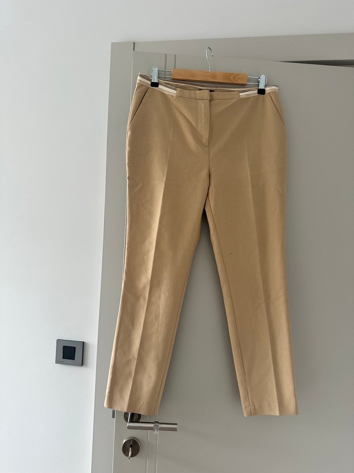 Bej renkli, midi boy, regular fit kadın kumaş pantolon. Belinde kemer detayı olan, pamuklu ipeksi dokulu, ofis için uygun minimal ve normcore tarzda. Diz yapmayan iç göstermeyen kumaş
