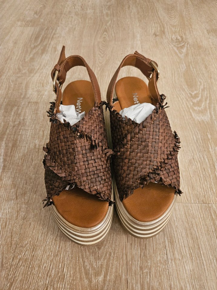 Parlak kahverengi hasır, dolgu topuklu sandalet, tokalı kayışlarla bohem tarzda. Günlük kullanım için uygun. 37 beden