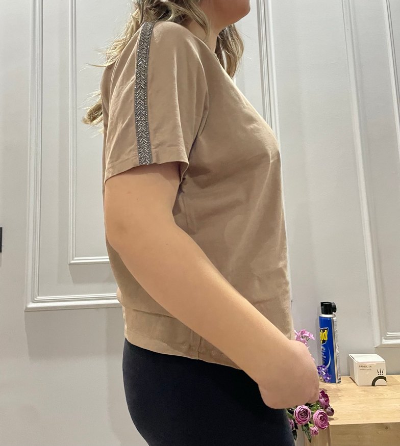 bej renkli, omuz detaylı, kadın network marka tshirt. L beden. Hiçbir defosu yok çok az kullandım yepyeni duruyor.