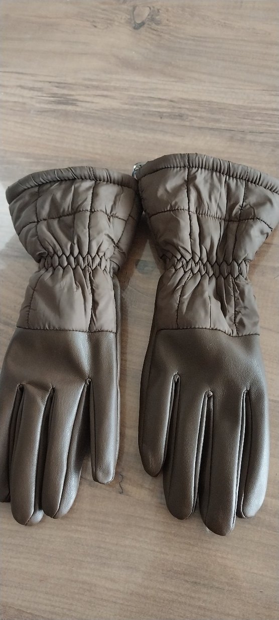 Kadın eldivenleri, kahverengi deri ve pliseli kumaşın birleşimiyle rahat ve şık bir biker tarz sunar.