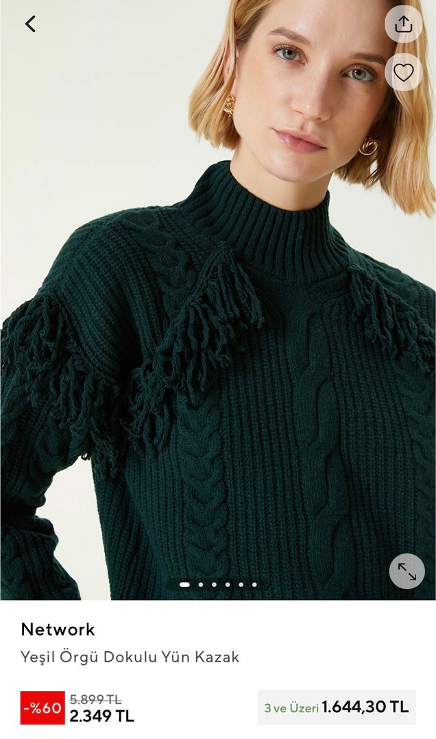 Regular fit. Balıkçı yaka, püskül detaylı, örgü dokulu, yün kazak. %80 Koyun Yünü,%20 Poliamid. Sıfır ürün Dikkat; renk haki değildir, seçenek olmadığı için mecburen işraretledim, petrol yeşili gibi çok güzel koyu bir renktir fotoğraflardaki gibi Güncel fiyatını görebilirsiniz o da 2 adet ürün alana o fiyat!