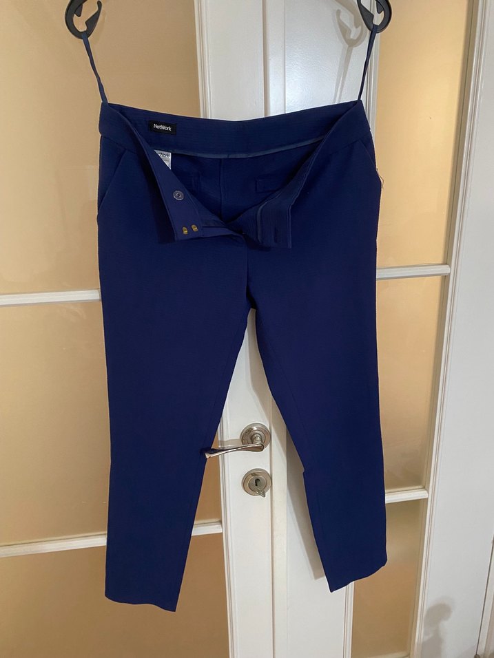 Lacivert renk, kemerli, midi boy kadın kumaş pantolon. Ofis kullanımı için uygun, düz ve yumuşak sentetik kumaştan üretilmiştir. Normcore ve trend görünüm sunar.