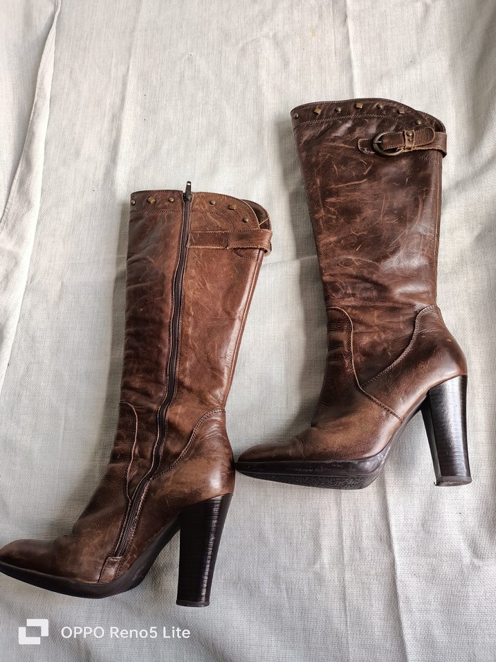 Network marka %100 içi ,dışı gerçek deri fermuarlı ,topuklu koyu kahve çizme.Cizmenin bilekten başlayan bacak boyu 28 cm ,çizmenin uzunluğu 45 cm,baldır genişliği tek taraflı 18 cm ,bilek genişliği tek taraflı 12 cm ,topuk boyu 9 cm dir.Ayakkabi numarası 36 kahverengi deri diz boyu kadın çizme, yüksek topuklu ve tokalı detaylı. Vintage tarzda, bohem görünüme uygun.