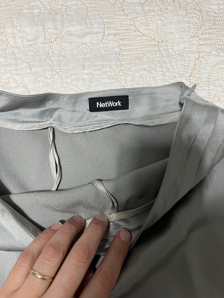 midi boy, bol kesim gri kadın saten etek NetWork markalı, ofis için uygun, yumuşak dokulu sentetik kumaş.