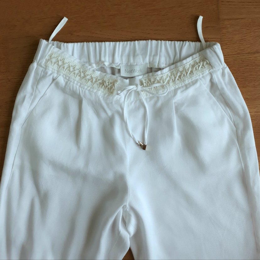 Yepyeni, hiç giyilmedi. Ekru, bol kesim kumaş pantolon. Parlak, ipeksi dokulu ve dantel detaylı. Lastikli, bağcıklı bel ile giyimi çok rahat. Kumaşı %100 Lyocell.