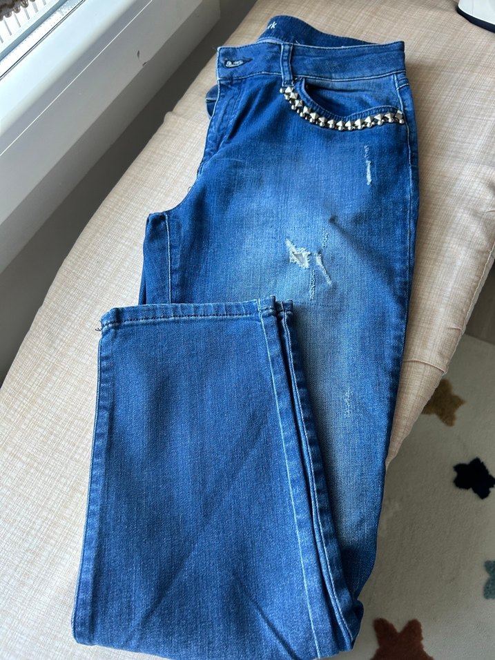 Zincir detaylı, bol kesim mavi denim pantolon. Parlak kumaş ve rahat sokak stili, günlük kullanım için uygundur. ✨