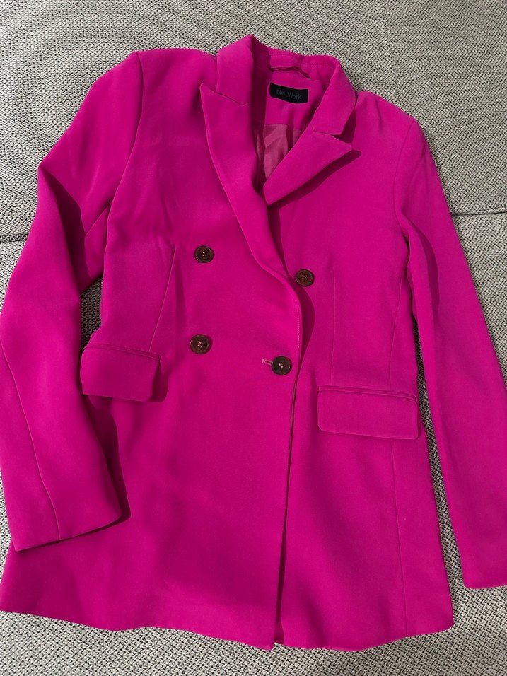 Pembe parlak renkte, düğmeli ve kesimli yakalı kadın blazer. Uzun kollu, normal midi boyda, rahat kesim. Ofis için uygun, yumuşak ve sıcak kumaştan yapılmıştır.