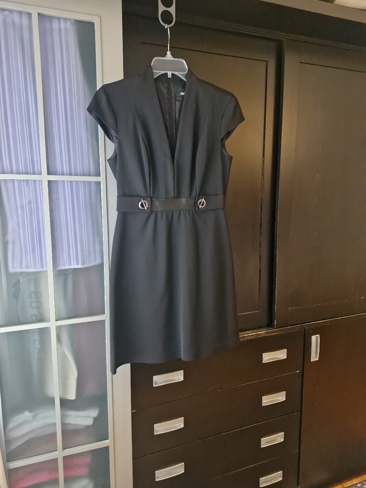 Network, S beden, kendinden Kemerli, V yakalı ve hafif kollu, klasik kesim, siyah midi elbise. Ofis için uygun, düz kumaştan yapılmıştır. içi astarlı. Çok az giyildi, yepyeni.