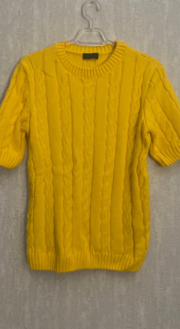 Bu dar kesim kadın kazak, canlı sarı renkte örgü kumaştan kısa kollu ve yuvarlak yaka tasarıma sahiptir. Rahat, desen içermeyen doku günlük sokak stiline uygundur.