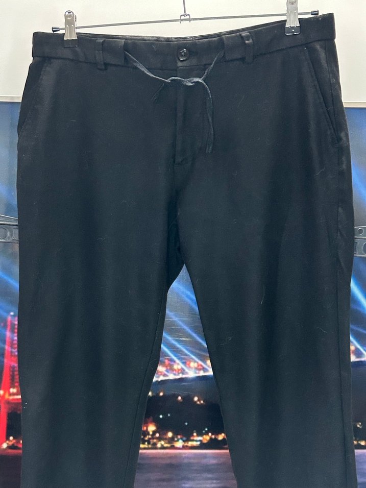 Siyah, regular fit ve midi boyda erkek pantolon. Sentetik kumaştan, kemerli bel detaylı, ofis ve sokak stiline uygun. 50 Beden