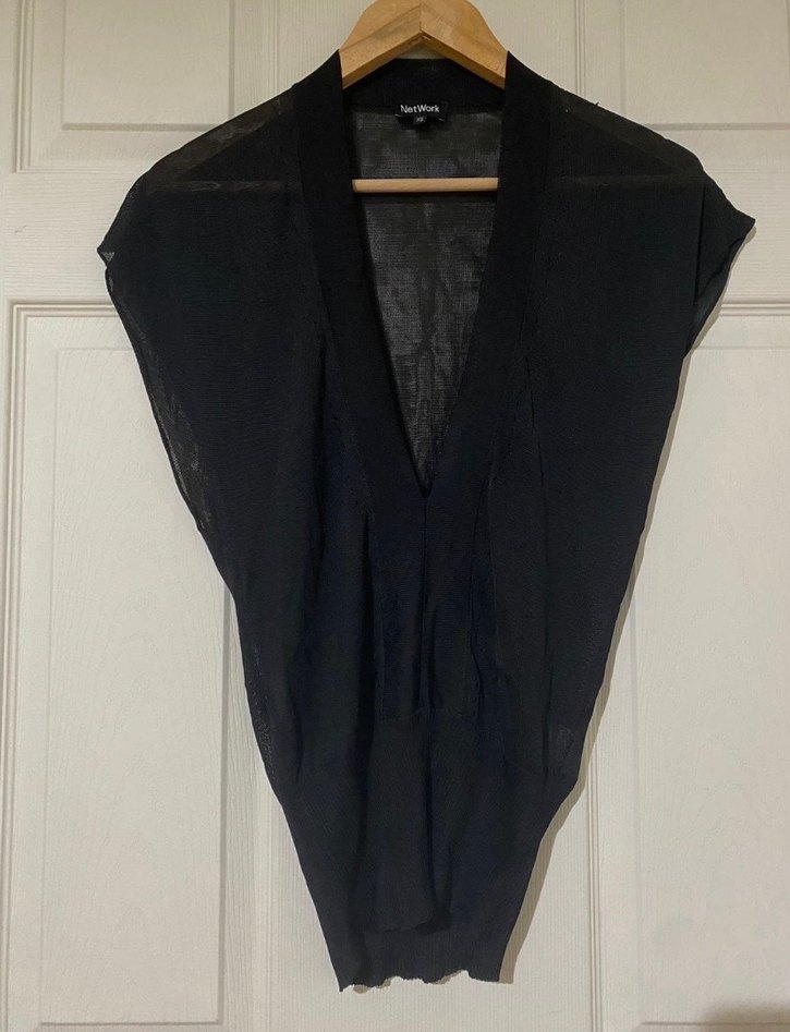 Siyah ince kumaştan, derin V yakalı ve kolsuz, dökümlü ve bol kesimli bir bluz. Ofis için uygun modern tarzda.
