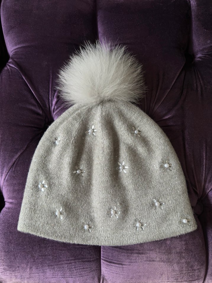 Gri örme kumaştan, tüylü ponpon ve ince boncuk detaylarına sahip kadın bere, rahat ve çağdaş tarzı bir araya getirir. ❄️1 kere kullanıldı
