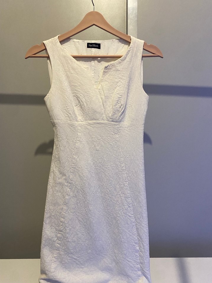 Kolsuz, V yakalı beyaz kalın kumaşlı astarlı elbise, kısa ve vücuda oturan kesimde. Minimalist, desensiz tasarımıyla klasik ve modern bir şıklık sunar. Ofis ve özel günler için uygundur. Kusuru yoktur. Dar kalıp olduğu için satıyorum, iyi günlerde kullanın