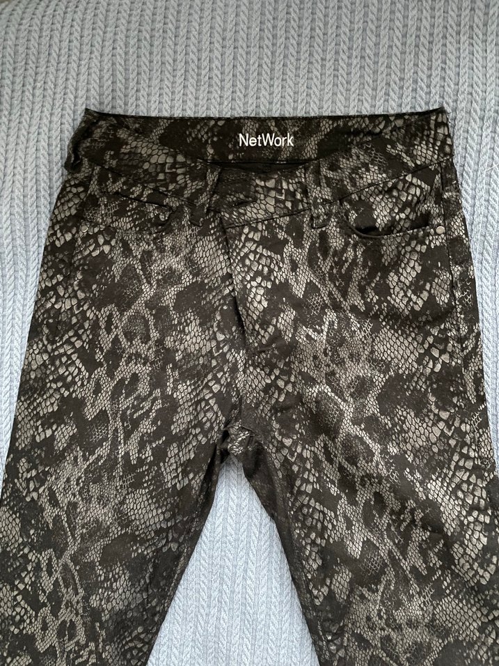 Network marka, az kullanılmış dar pantolon. Esnek likralı kumaştır. Yılan desenlidir.