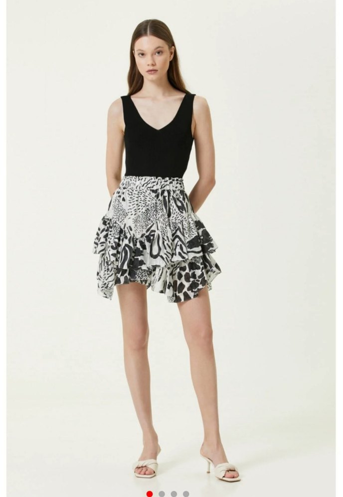 Gri zebra desenli, beli lastikli kat kat fırfırlı mini etek. Boyu en uzun uçda 50cm en kisada 42 cm. Dolapta bekledi hiç giymedim.
