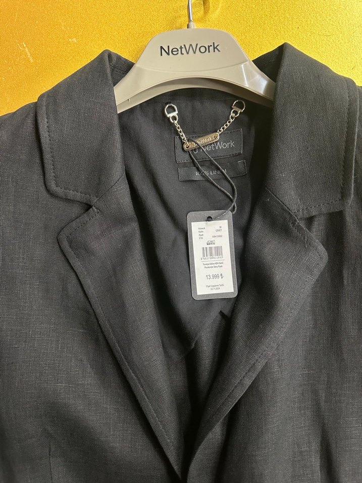 NetWork markalı, zincir detaylı, SİYAH renkli kadın blazer ceket. Yumuşak keten kumaş, normal kesim, uzun kollu ve midi boyda, ofis için uygun.