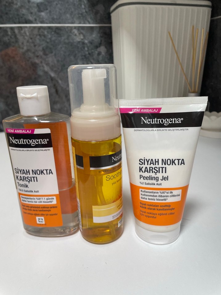 Neutrogena siyah nokta karşıtı tonik, yatıştırıcı köpük ve %2 salisilik asitli peeling jel içerir. Gözenekleri temizler, siyah noktaları azaltır.