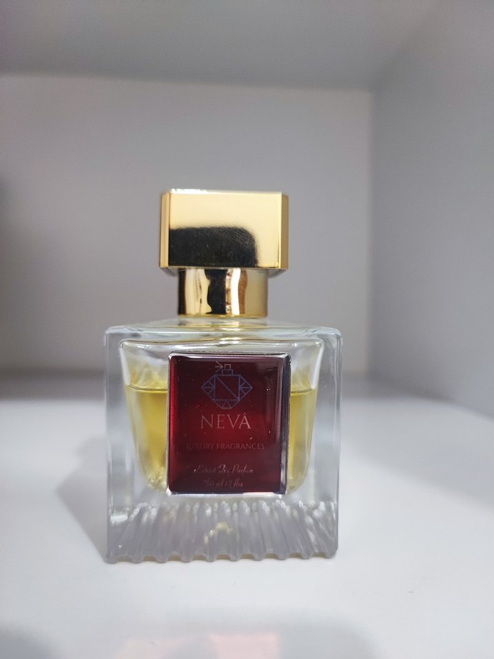 Neva erkek parfümü, bordo etiket ve altın kapak detaylarıyla modern klasik ve gösterişli bir tarz sunar. Şeffaf cam şişede kokusu görünür.
