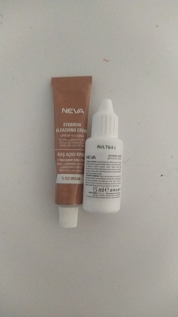 Neva kaş açıcı krem, bej açık renkte, 7 seviyeye kadar açma sağlar ve %100 vegandır. 15 ml tüp ve aktivatörden oluşur.